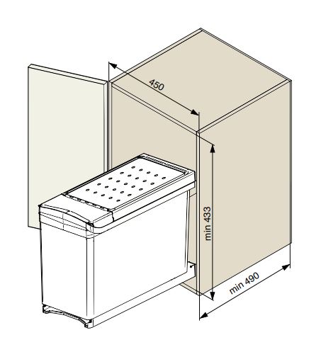 Tento odpadkový koš je určen k instalaci na dno skříňky se standardními bočně otevíranými dvířky.