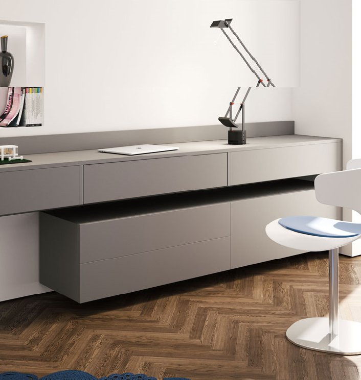 - stolová deska je skrytá za čílkem zásuvky a po vysunutí dorovná výšku desky korpusu, ve které je umístěna