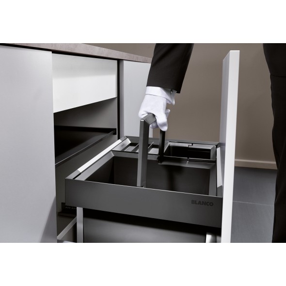 Odpadkový vestavěný koš s čelním výstupem, který přináší dokonalou kombinaci praktičnosti a moderního designu. S dvěma nádobami o objemu 19 litrů přičemž každá poskytuje dostatek místa pro vaše odpadky. Blanco Flexon II se vejde do skříňky o šířce 30 cm. Kvalitní plnovýsuv s tlumením zajišťuje plynulý a bezproblémový provoz.