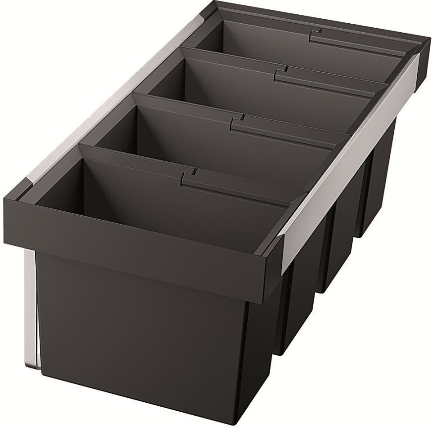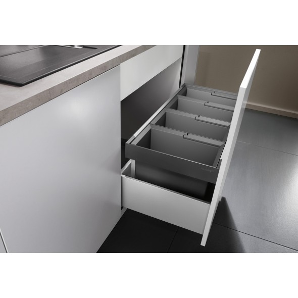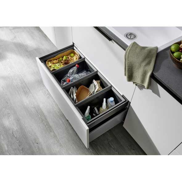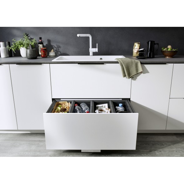 Odpadkový vestavěný koš s čelním výstupem, který přináší dokonalou kombinaci praktičnosti a moderního designu. Se čtyřmi nádobami o objemu 3x19 a 1x16 litrů přičemž každá poskytuje dostatek místa pro vaše odpadky. Blanco Flexon II se vejde do skříňky o šířce 90 cm. Kvalitní plnovýsuv s tlumením zajišťuje plynulý a bezproblémový provoz.