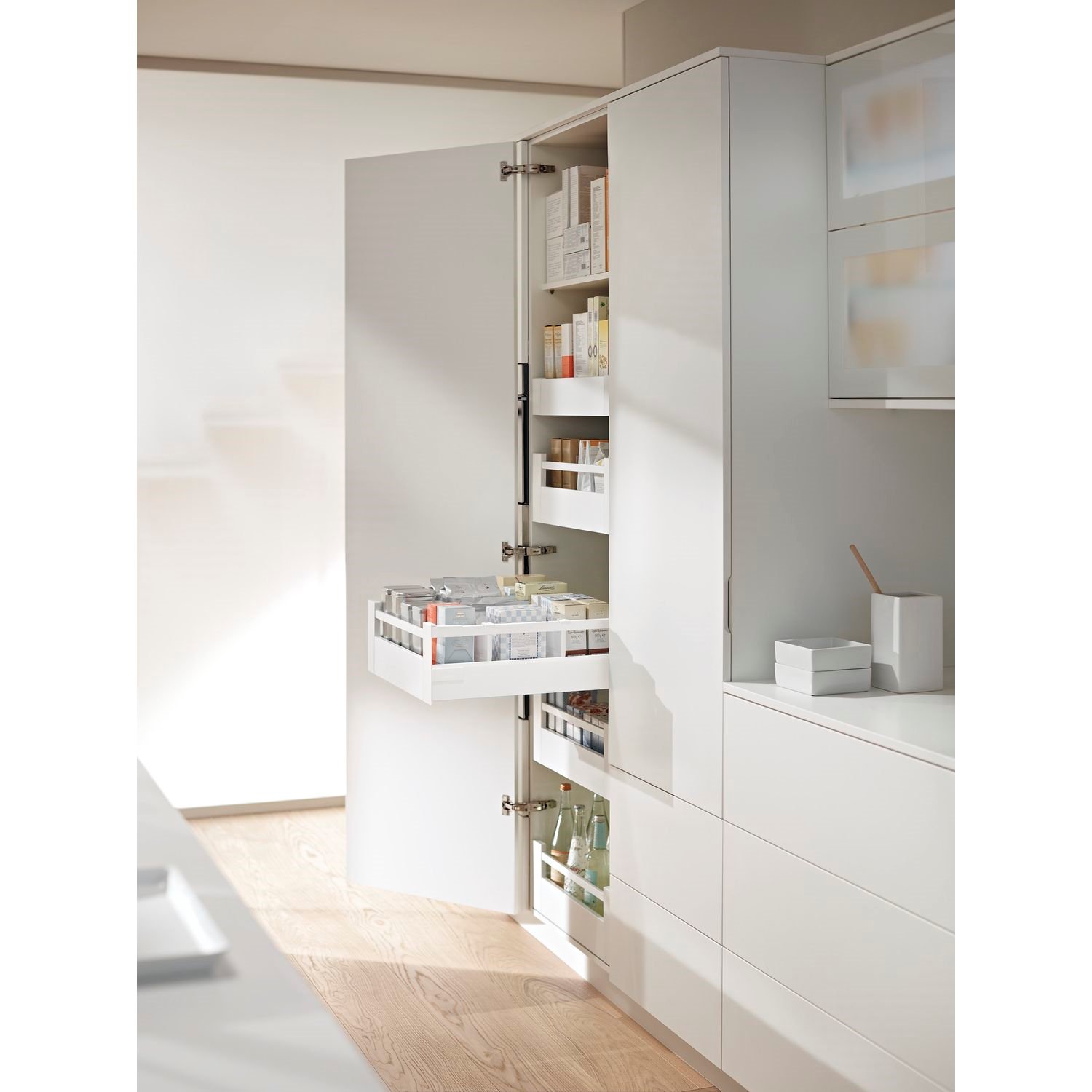 BLUM Space Tower v odstínu bílá obsahuje kování pro potravinovou skříň, do maximální šíře korpusu 600 mm.