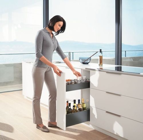 BLUM Space Twin Legrabox v odstínu bílá obsahuje kování pro úzkou skříňku, od šíře korpusu 200 mm.