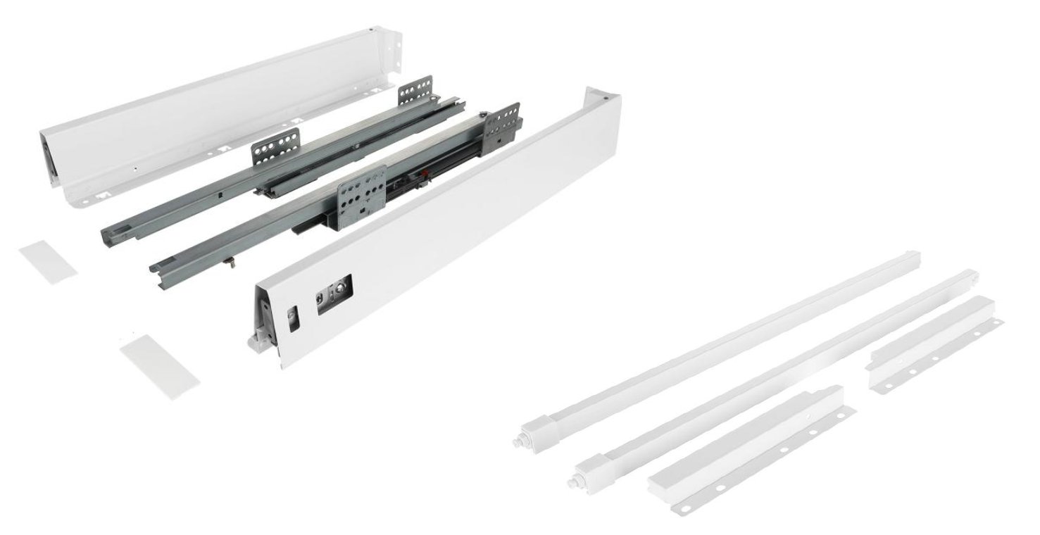 Plnovýsuv A-Box s dutou bočnicí a s integrovaným plynulým dotlumením Soft-close určená pro potravinové a šatní skříně.