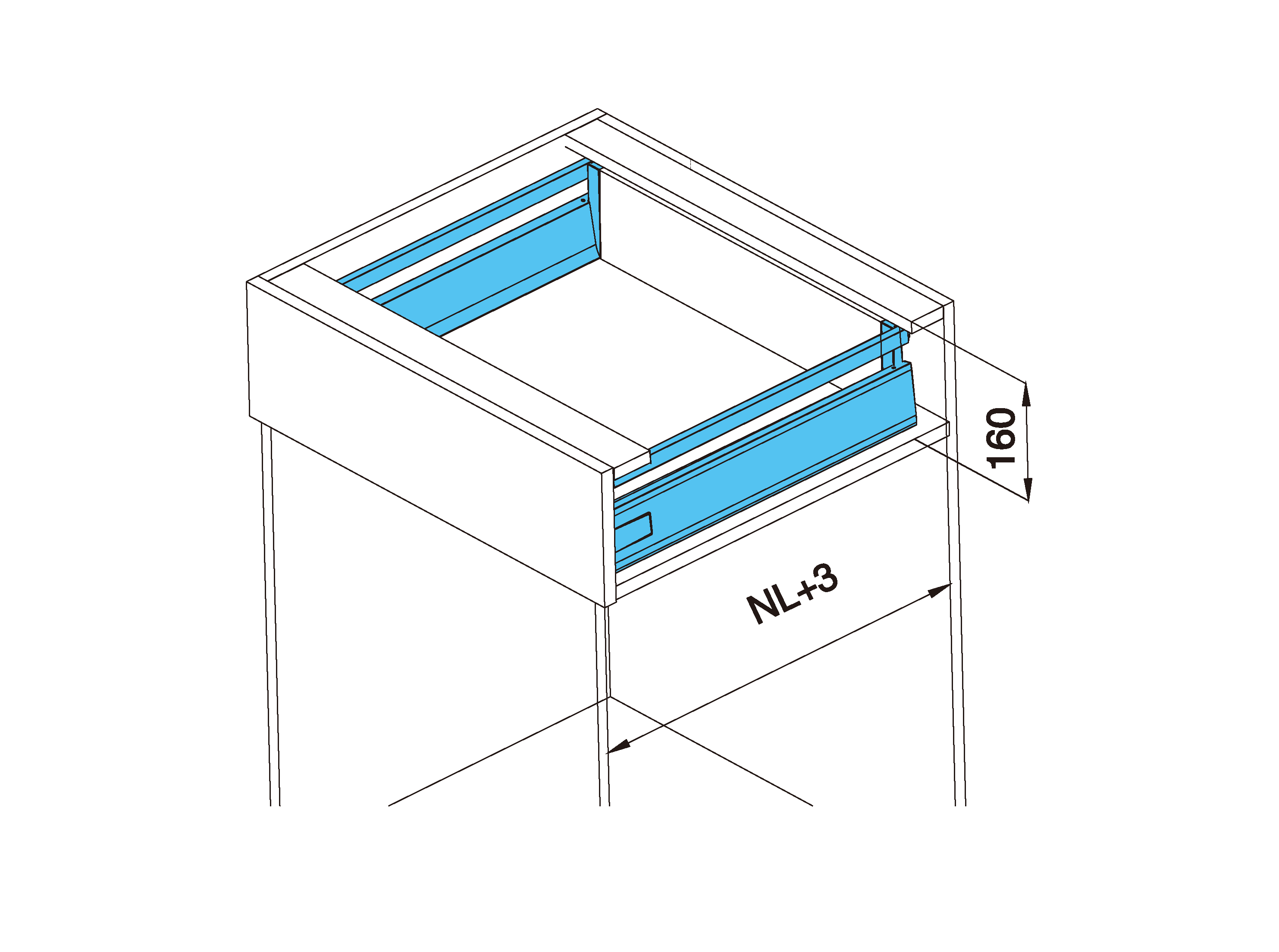 Vnitřní zásuvka A-Box s dutou bočnicí a s integrovaným plynulým dotlumením Soft-close určená pro potravinové a šatní skříně.