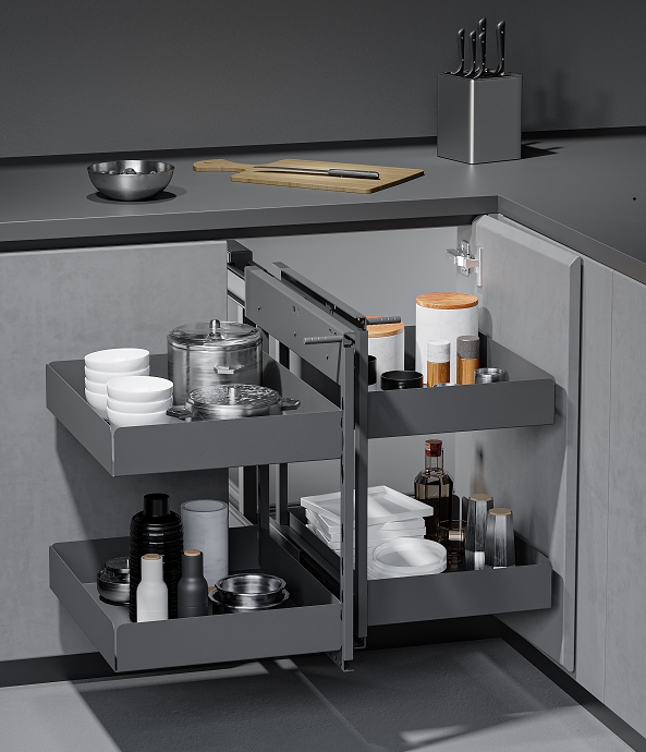 Maximální využití prostoru v rohové skříňce s plynulým dotlumení a moderním designem od firmy CEMUX.