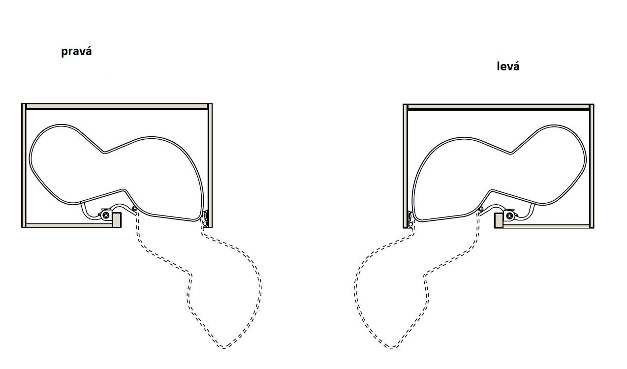 Montáž police na pravý bok skříně a police vyjíždějí na pravou stranu.