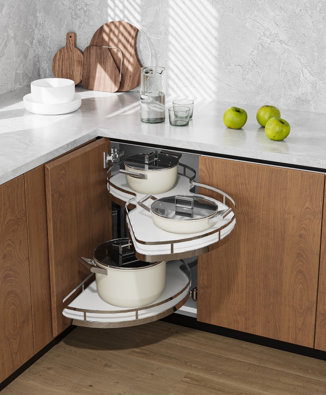 Maximální využití prostoru v rohové skříňce s plynulým dotlumení a moderním designem od firmy CEMUX.