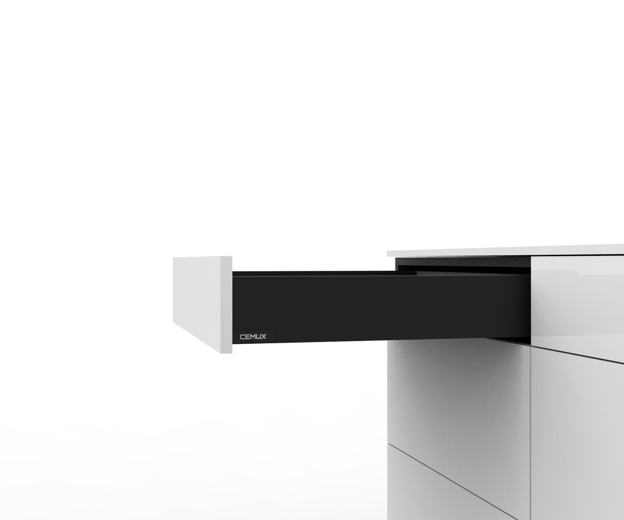 Cemux kování pro potravinovou skříň H Box SLIM v odstínu černá je určené pro výrobu vnitřních zásuvek s 1 nízkou a 4 vysokými šuplíky, pro šířku skříně do 450 mm.