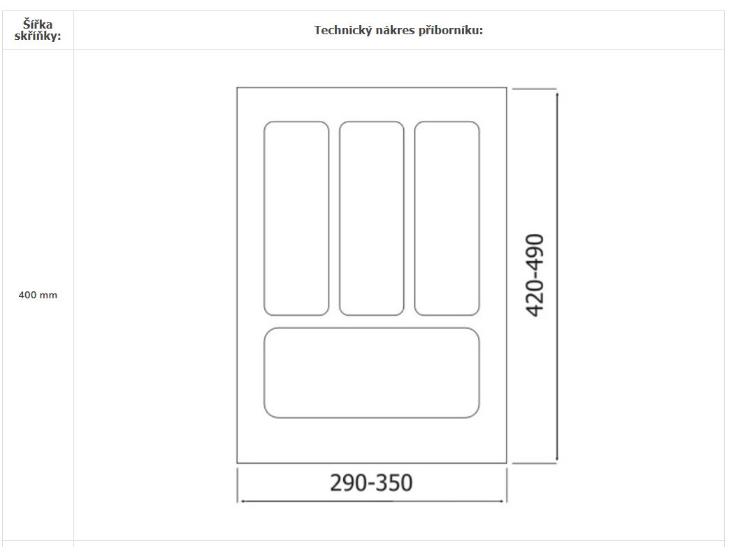 - Čistý rozměr příborníku: š. 350 x hl. 490 x v. 55 mm