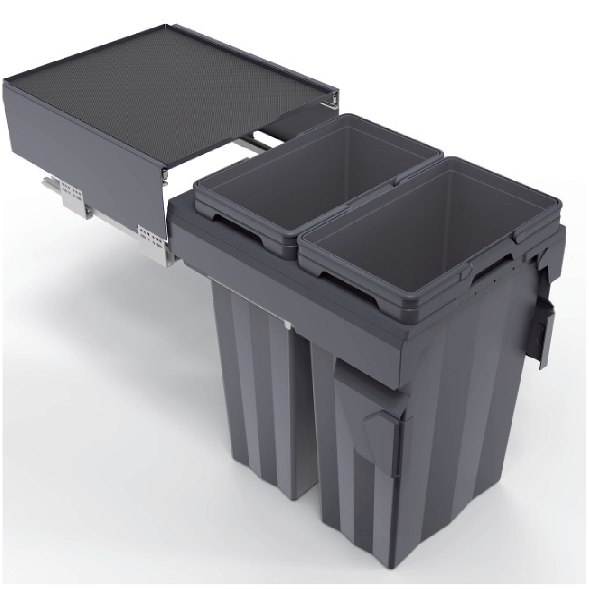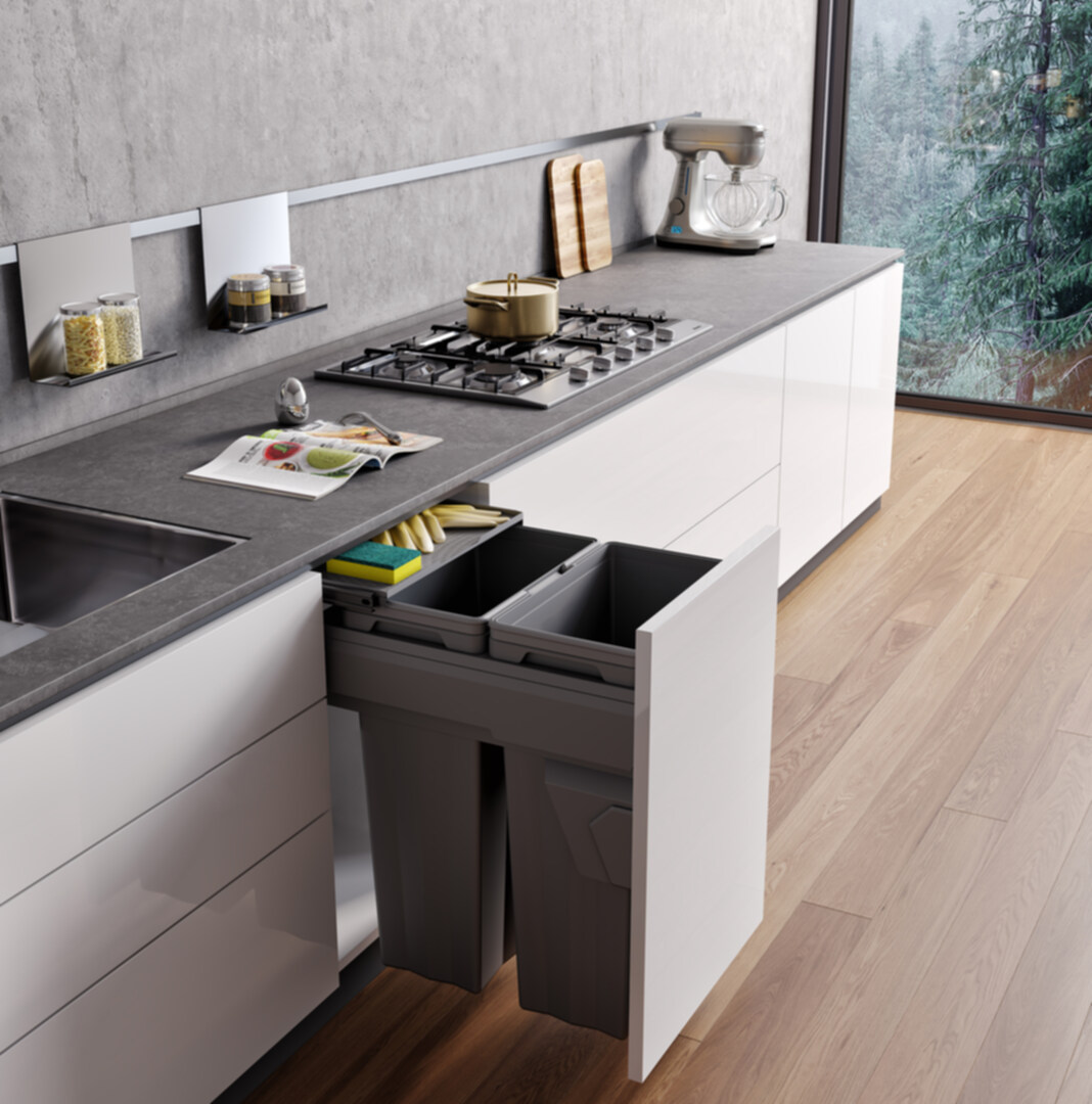 Velkokapacitní výsuvný odpadkový koš Cemux sorter HQ na tříděný odpad se skrytým plnovýsuvem s tlumením, včetně výsuvné police.