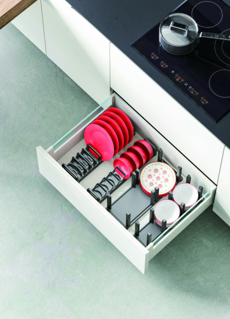 Praktický držák a odkapávač na misky do zásuvek pro hloubku 500 mm s přizpůsobitelnými příčkami.