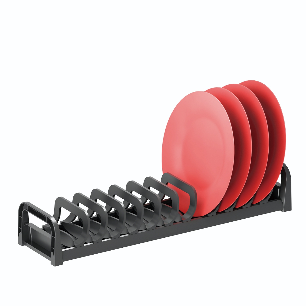 Praktický držák na talíře s přizpůsobitelnými příčkami do zásuvek pro hloubku 500 mm. Držák je v šedém provedení a je vyroben z odolného plastu.