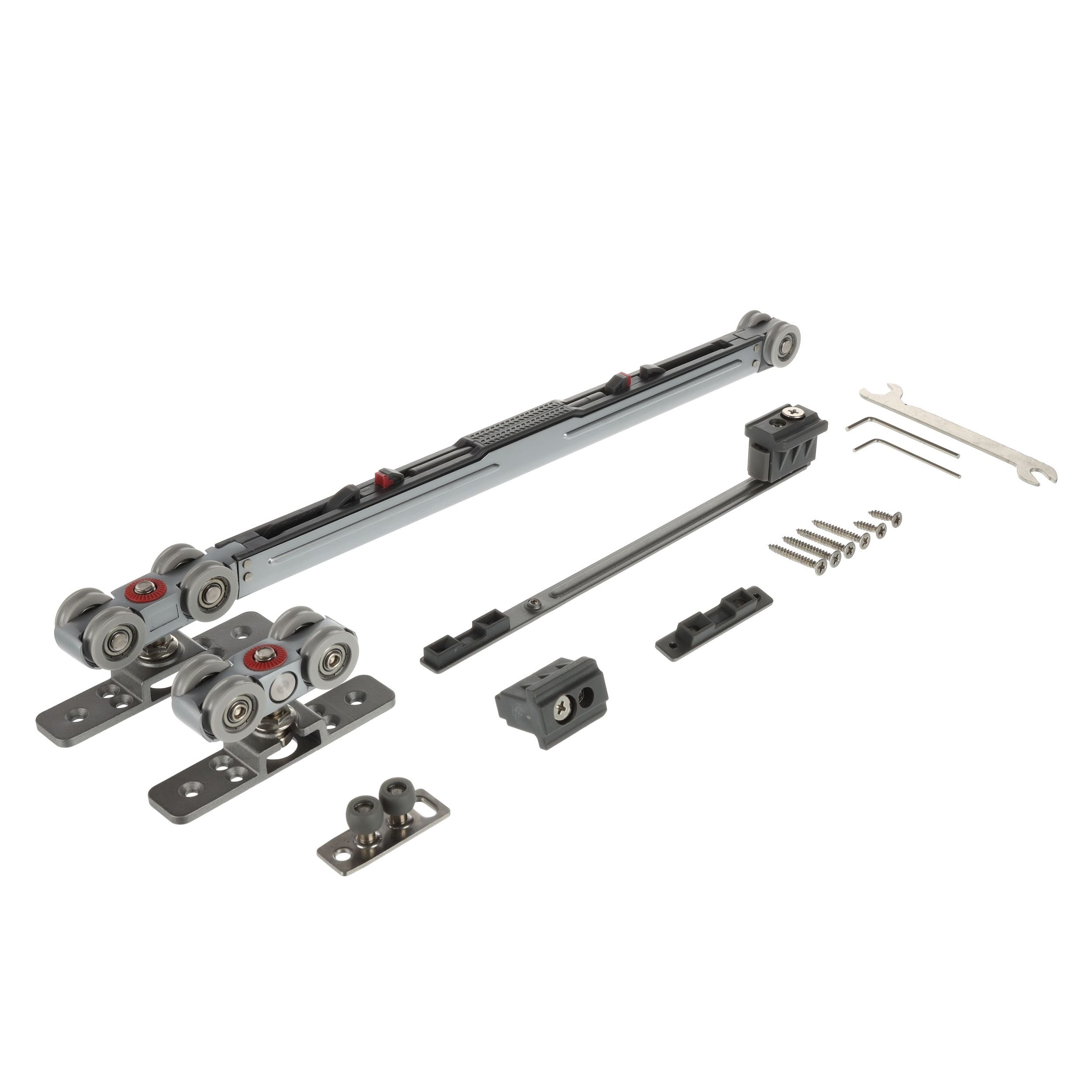 Sada kování pro 1 křídlo pro posuvné dřevěné dveře firmy Cemux STARSHIP STANDARD dodávané včetně černé kolejnice.