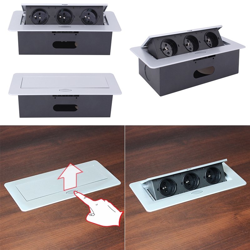 Elektrická výklopná vestavná zásuvka LIFTBOX od firmy Cemux je určená k montáži do stolové desky do kanceláří, učeben a kuchyní.