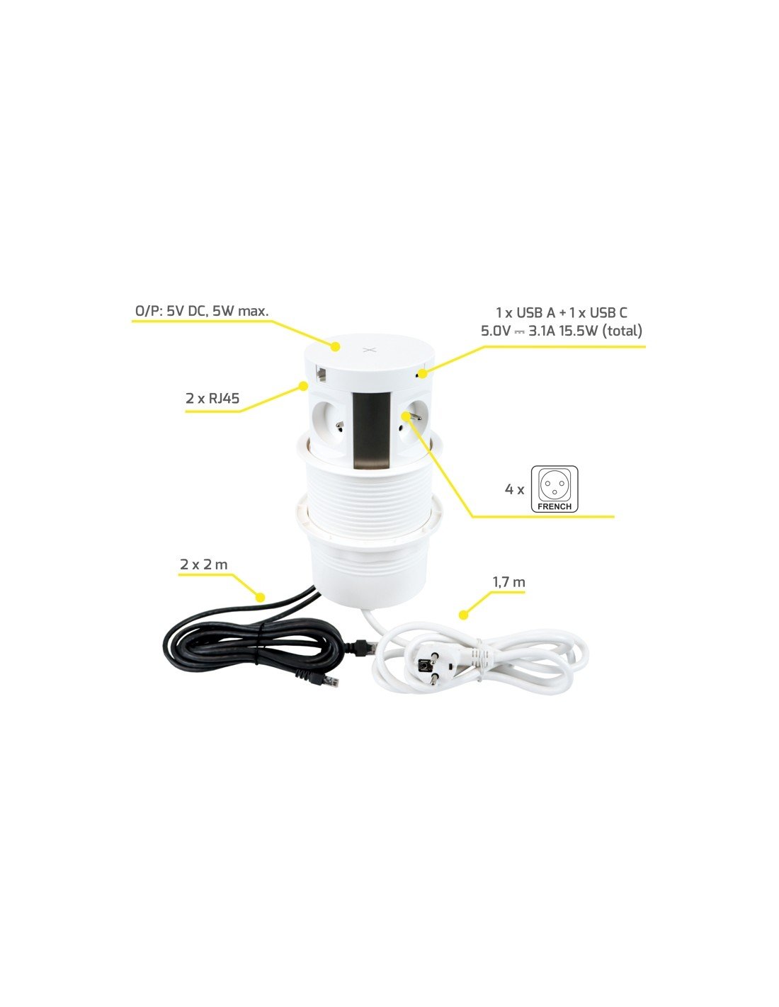 - 4 x zásuvku 230V a 1 x USB A,1 x USB C nabíjecím portem 5V / 3,1 A a 2 x zásuvku RJ 45 pro internet