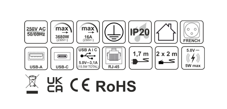 - 4 x zásuvku 230V a 1 x USB A,1 x USB C nabíjecím portem 5V / 3,1 A a 2 x zásuvku RJ 45 pro internet