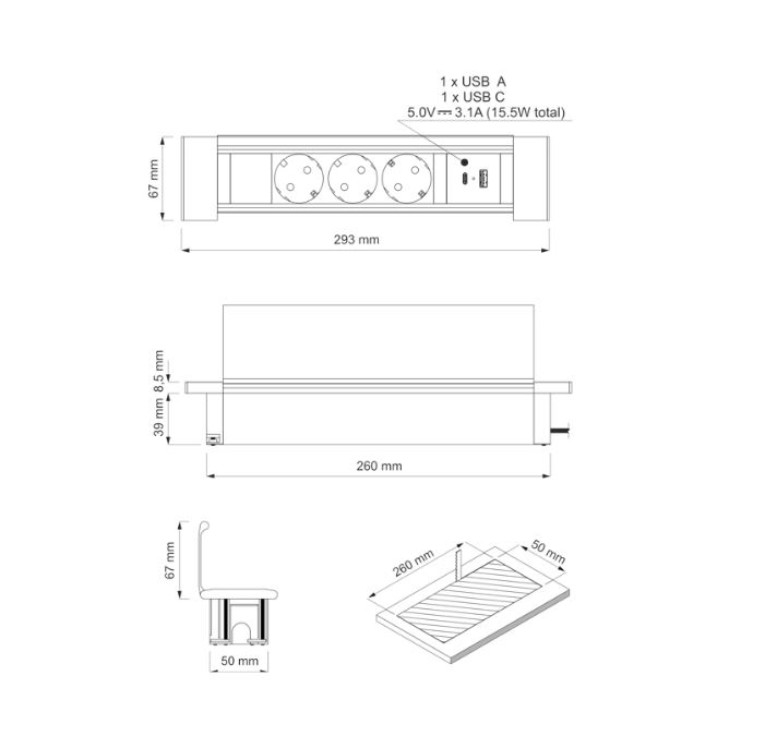 2 x USB porty A + C (5 V DC max. 3,1A/ 15,5 W).