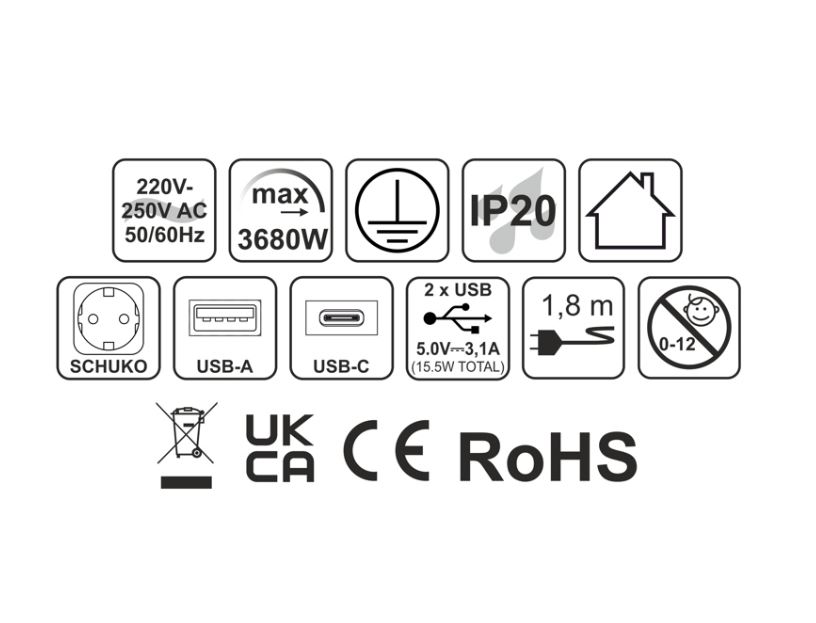 Zásuvka je vyrobena z hliníku a plastu a je vybavena napájecím kabelem o délce 1,8 m zakončeným euro zástrčkou.