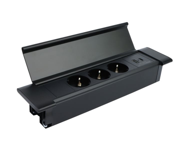Design Light otevírací zásuvka FLATBOX 3x 230V a 2x USB A/C nabíječka černá