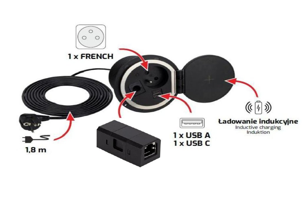 - zásuvka obsahuje: 1 x zásuvku 230V a 2 x USB nabíjecím portem 5V / 2,4 A a 1 x zásuvku RJ 45 pro internet