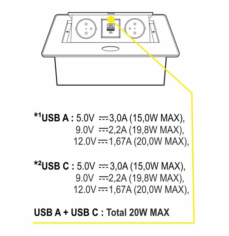 - výklopná 2 zásuvka s kabelem 3 m a uzemněním a 2x USB porty