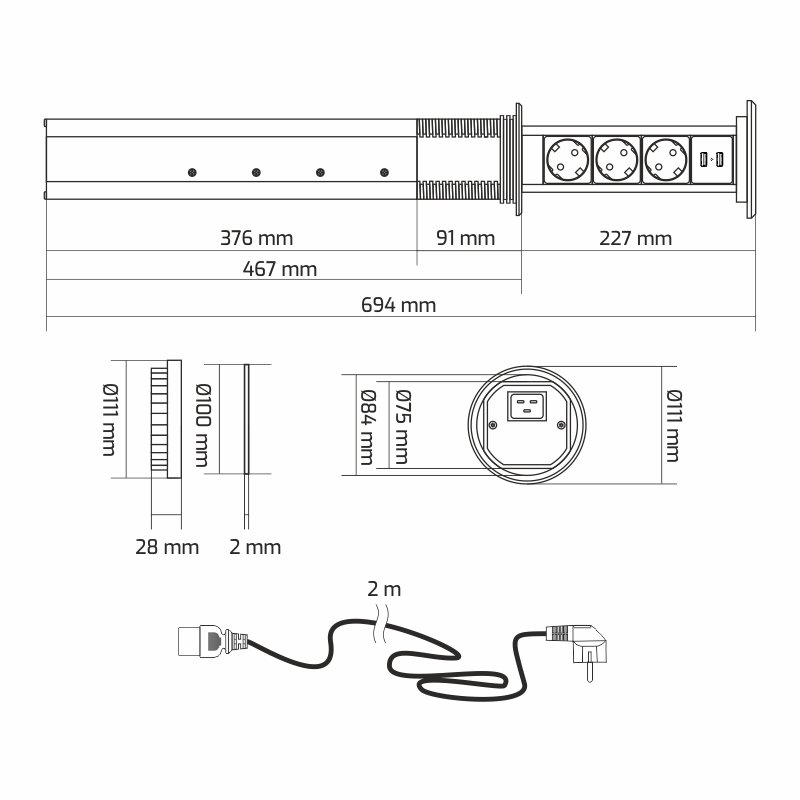 - elektromotorem ovládaná výsuvná trojzásuvka 3x230V + 2xUSB