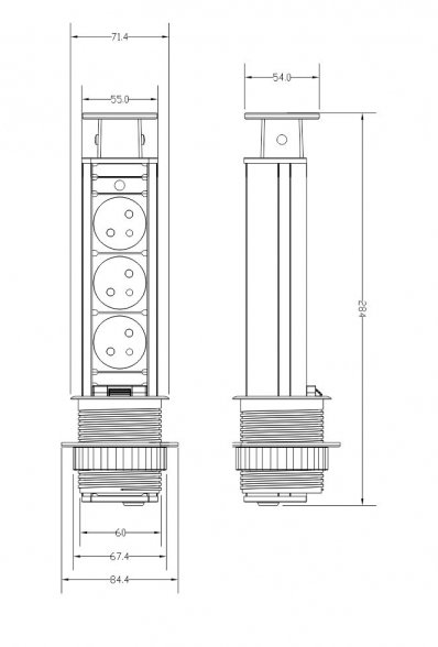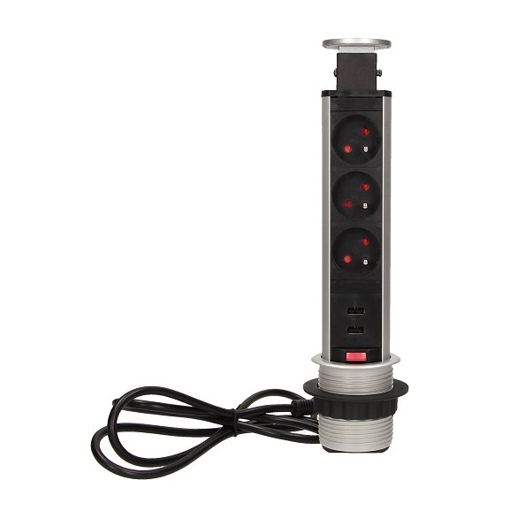 - Design Light zásuvka elektro stolová výsuvná věž 60 mm- 3x zásuvka 2xUSB+ kabel stříbrná/ plast