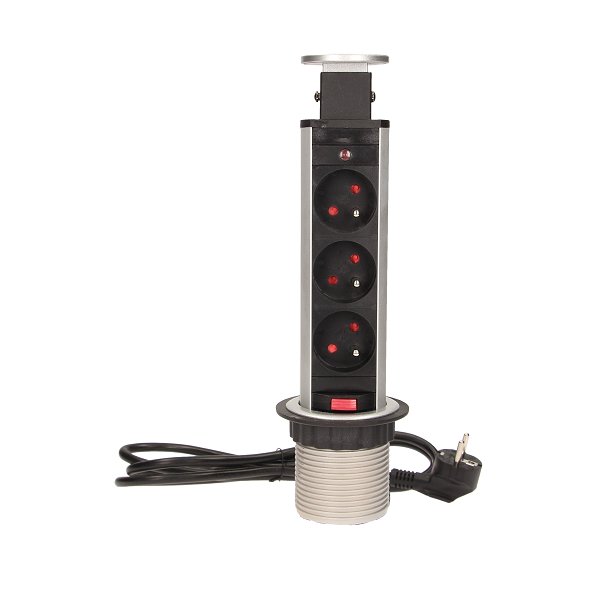Design Light zásuvka elektro stolová výsuvná věž 60mm- 3x zásuvka + kabel stříbrná/ plast