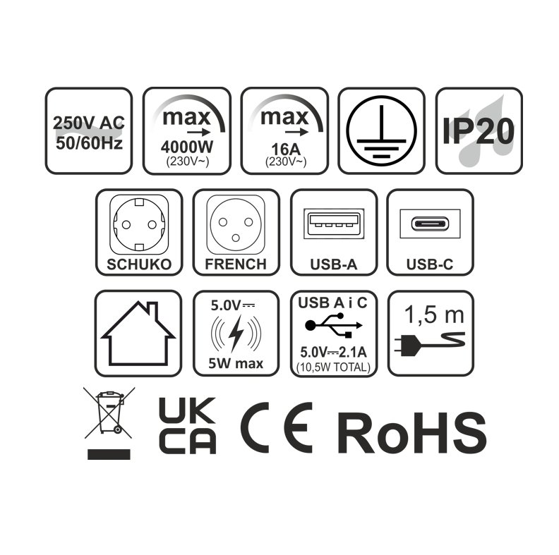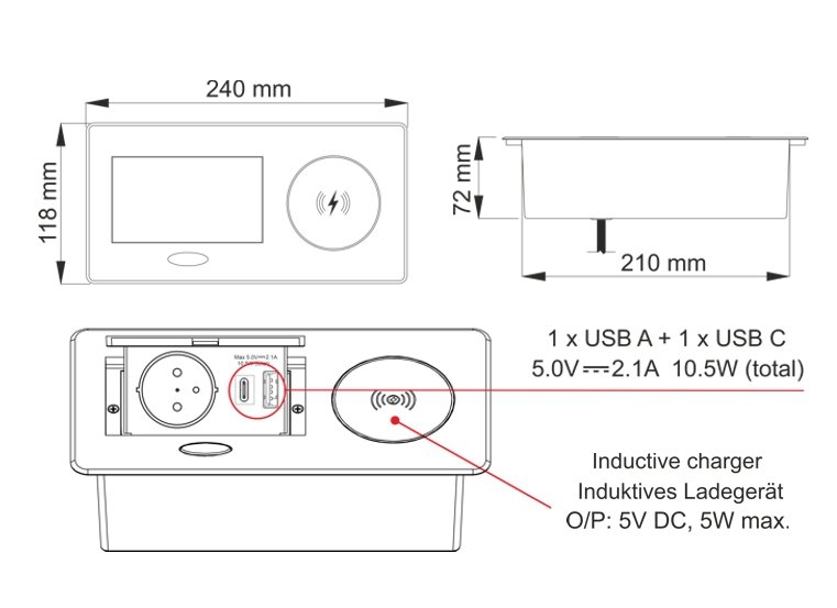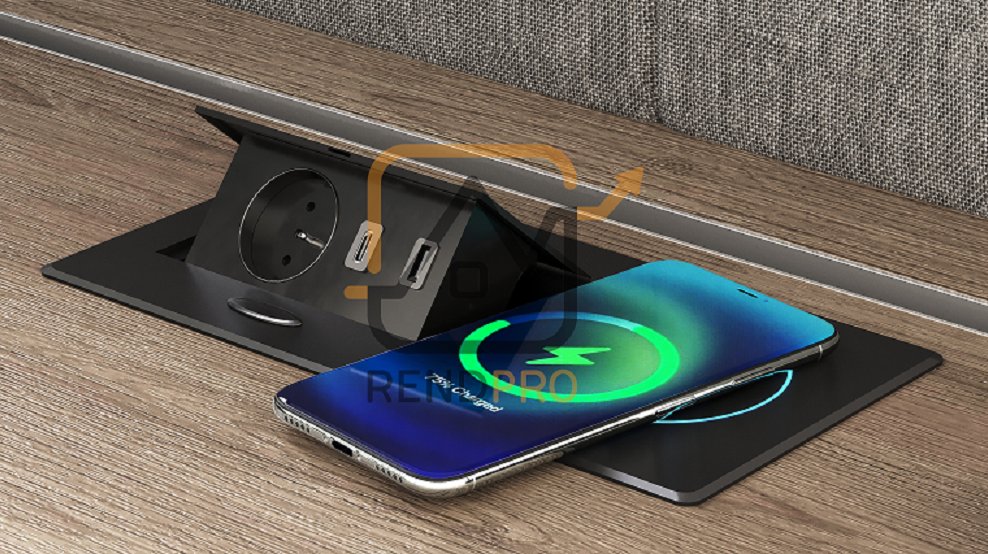- výklopná zásuvka 1x 230V a 2x USB porty 1x USB-C + 1x USB-A včetně bezdrátové indukční nabíječky