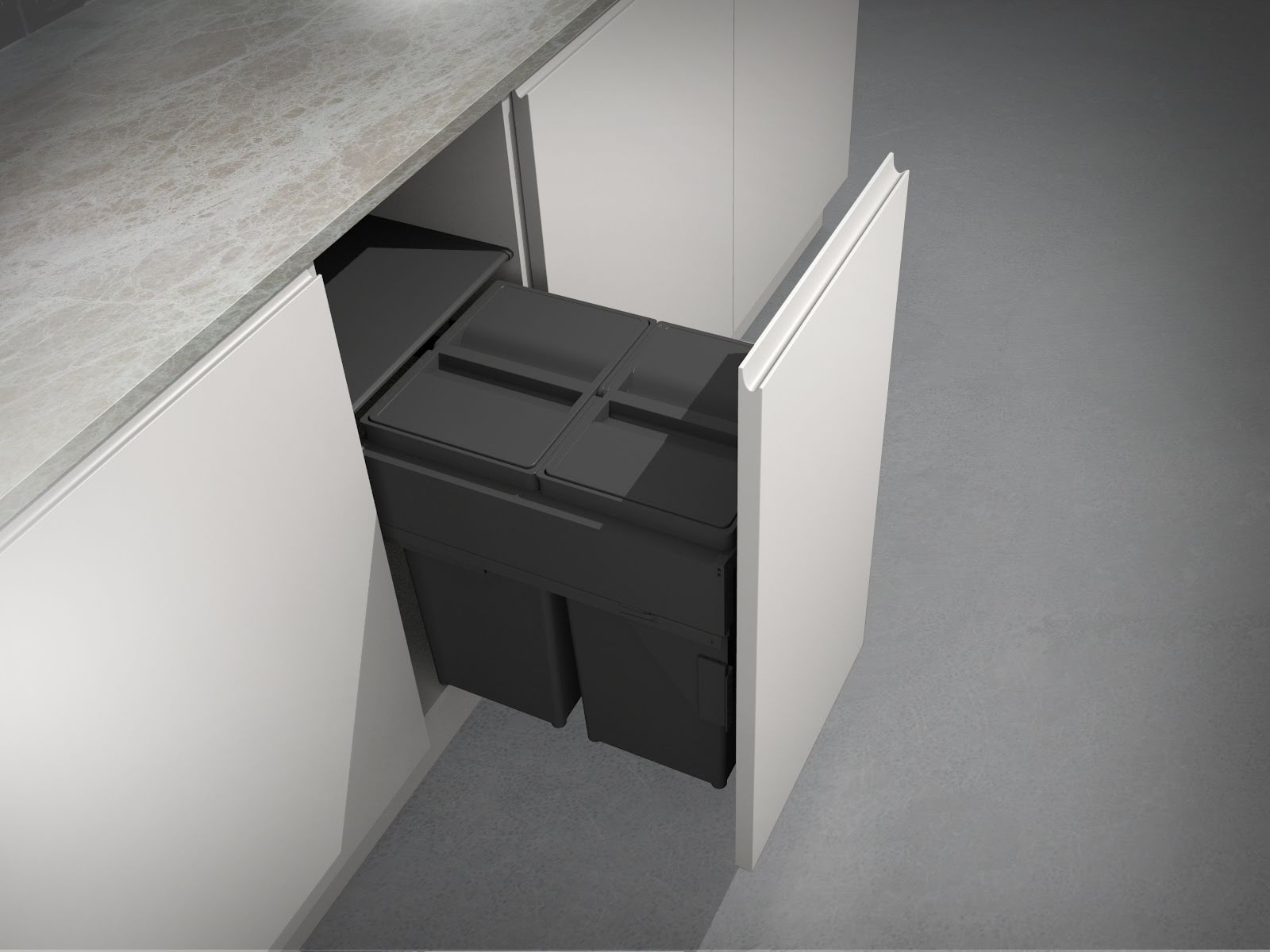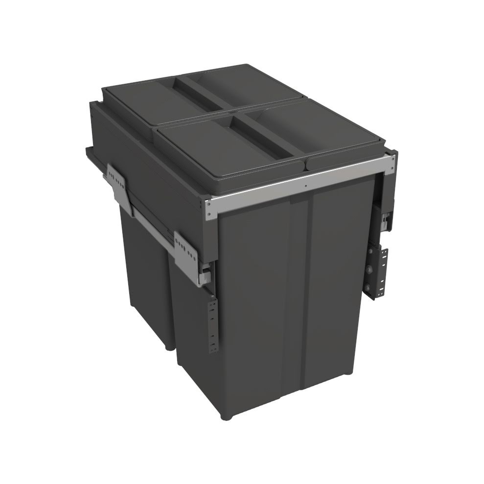 Velkokapacitní výsuvný zabudovaný odpadkový koš na tříděný odpad.