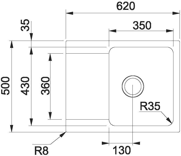 Dřez nemá otvor na baterii, lze vyvrtat vykružovacím vrtákem přímo na montáži.