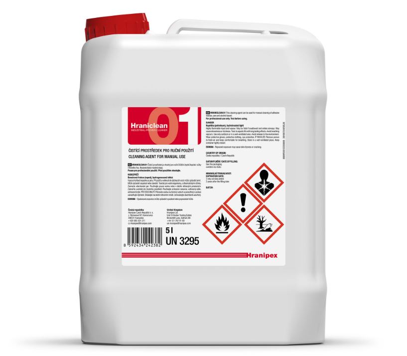 Speciální čirý čistící prostředek Hraniclean 01 bez obsahu agresivních rozpouštědel na ruční čištění plastů se vyznačuje značnou čistící silou, rychlým osycháním povrchu. Je vyroben na bázi uhlovodíků a alkoholu, odpařuje se beze zbytků a jako bonus jemně voní po citrusech.