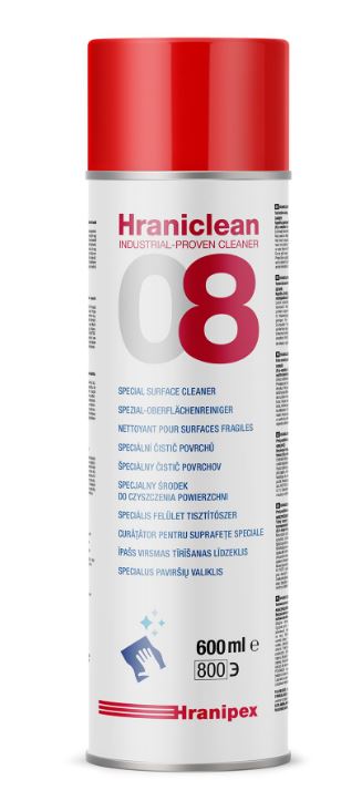 Speciální čistící prostředek Hraniclean 08 sprej je vhodný pro čištění citlivých povrchů, odstranění stop mastnoty, tužek i fixů. Poradí si se zbytkovým lepidlem a papírovými samolepkami. Díky své všestrannosti a příjemné vůni je vhodným pomocníkem nejen do výrob, ale i v domácnosti