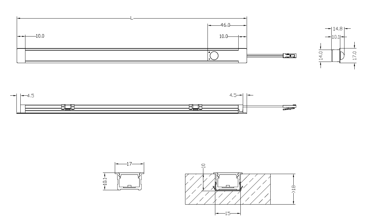 Přívodní kabel s minizásuvkou včetně pohybového vypínače se stmívačem je určený pro LED profil Celux SLS-03 s montáží k zafrézování.