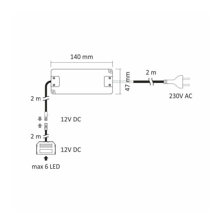 Součástí zdroje je zástrčka na 230V o délce 2 m.
