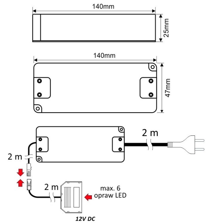 Součástí zdroje je zástrčka na 230V o délce 2 m.