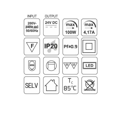 Je vhodný pro nápájení LED osvětlení s napětím 24V DC a celkovým výkonem do 100W.