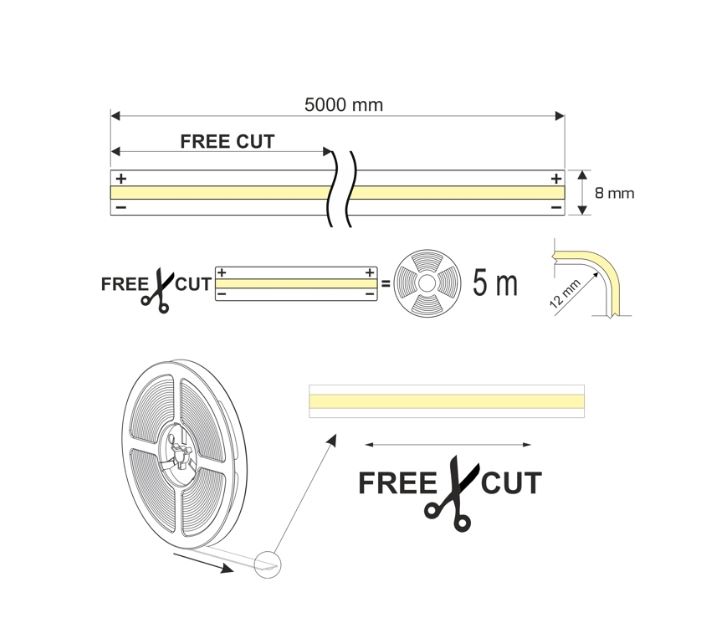 LED pásek COB FREE CUT představuje generaci LED pásků, které zajišťují rovnoměrné a plynulé osvětlení bez rušivých světelných teček. Díky technologii COB (Chip on Board) dosahuje vysokého světelného výkonu, skvělé intenzity a zároveň úspory energie.