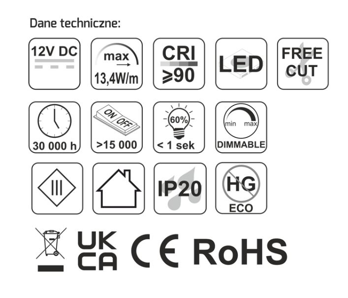 - Příkon: 13,4W/m