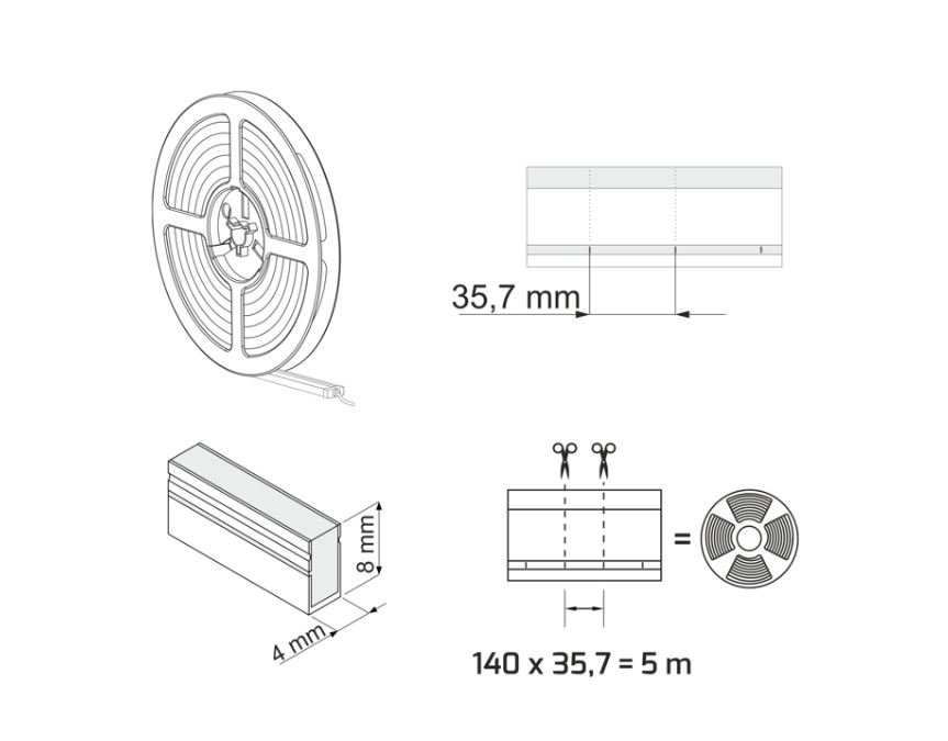 Při spotřebě 6,2W/m dosahuje světelného toku 580 lm/m. Možnost zkracovat po 35,7 mm.