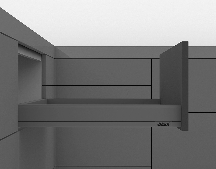 Sadu kování pro zásuvku s úzkou bočnicí 12,8 mm od firmy BLUM Legrabox N využijete při výrobě šuplíků v kuchyni pod troubu.