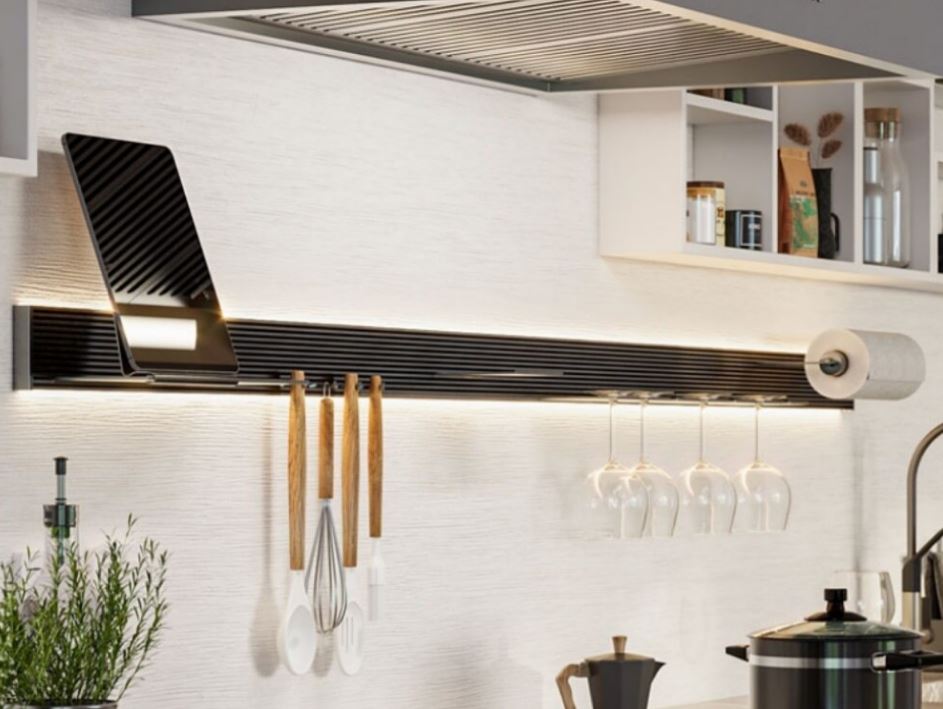 Moderní závěsný nástěnný systém do kuchyně, který spojuje funkčnost s jednoduchou instalací.