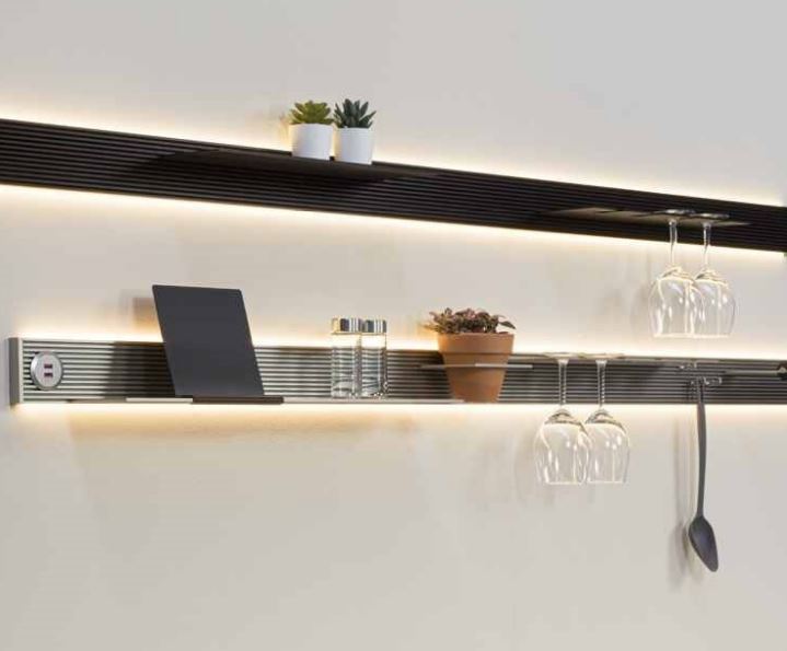 Systém se skládá z hliníkového profilu, nástěnných příchytek a variabilního příslušenství. Elegantní černý povrch a netradiční design zaujmou nejen v kuchyni. Originální provedení umožňuje flexibilní umístění závěsného příslušenství v libovolné poloze díky integrovaným drážkám.