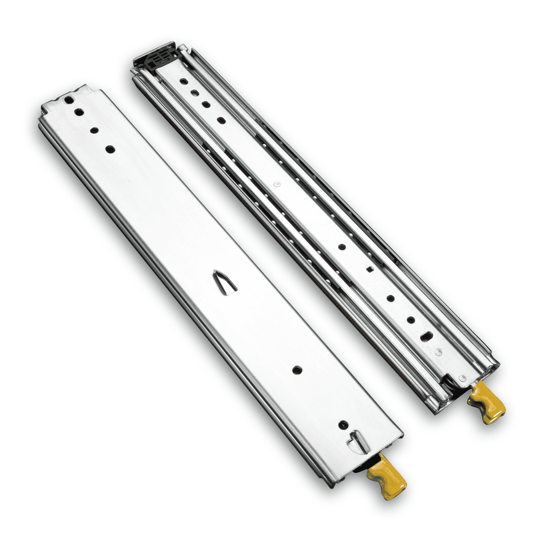 Kuličkový plnovýsuv bez dotlumení s aretací je navržen pro extrémní zátěž, s nosností až 225 kg je ideální pro zásuvky, které vyžadují maximální odolnost a bezpečnost.