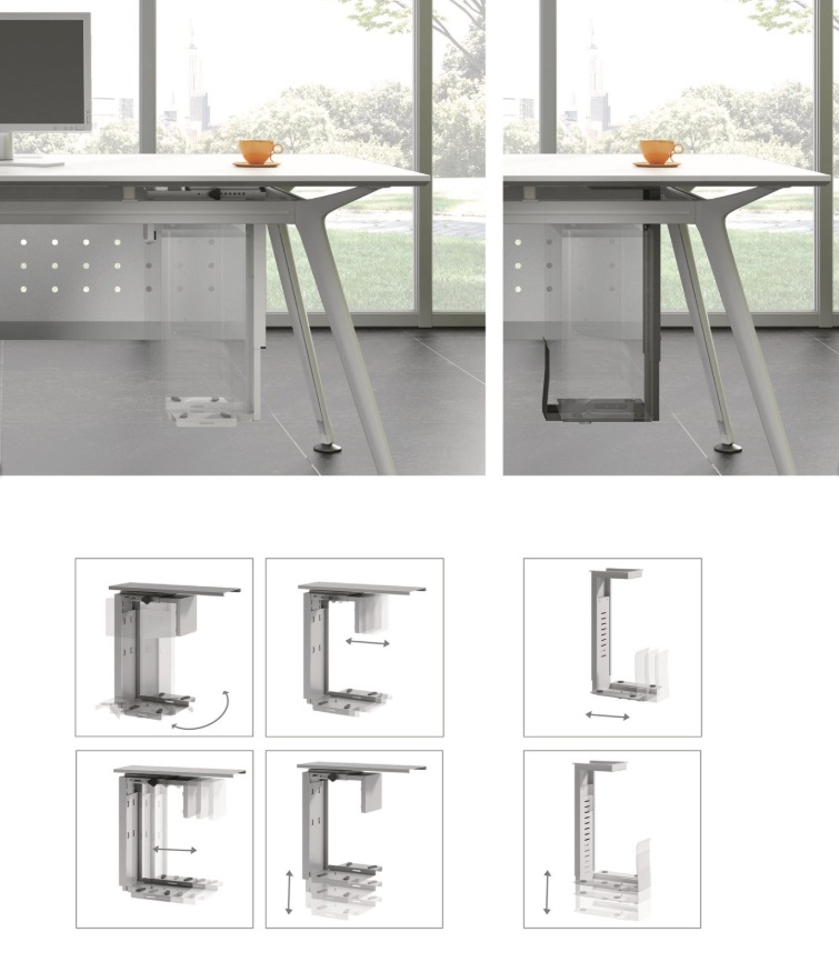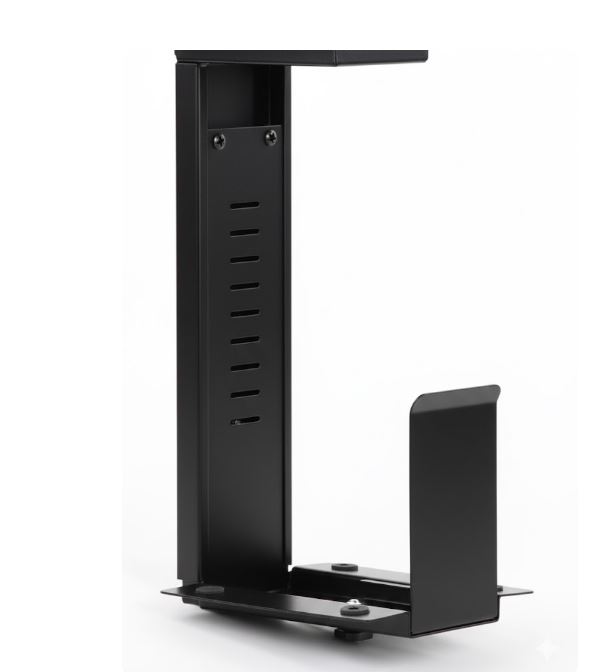 Praktický držák na počítačovou skříň určený pro montáž pod stolovou desku šetří místo a chrání PC před prachem.