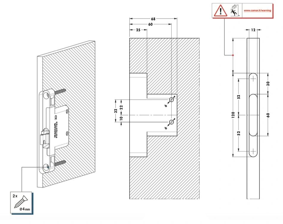 Rektifikační závěs umístěný v hraně korpusu. Je nutné použít závěsný plech pro tento závěs.
