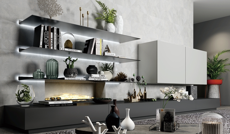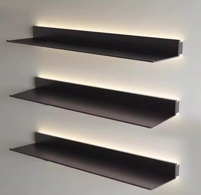 Hliníkový policový systém Shelf s možností podsvícení jako doplněk moderního interiéru.