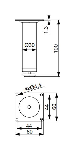 Ocelová nábytková nožka kulatá s regulovatelnou délkou - 100 mm, chrom lesk.