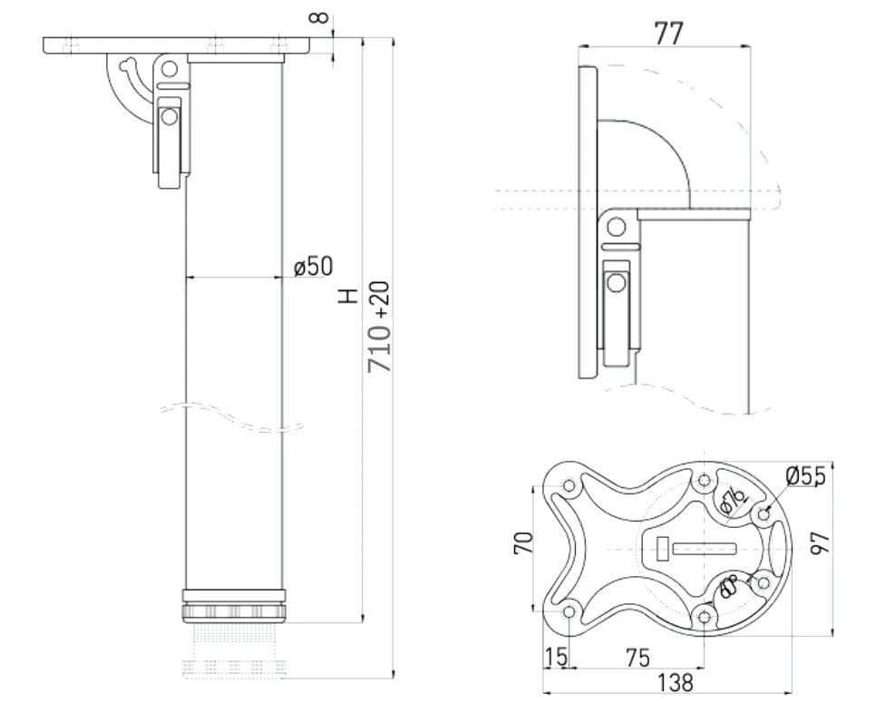 Díky sklápěcí hliníkové přírubě je noha snadno otočná, a spodní rektifikace umožňuje nastavení výšky až o + 20 mm.