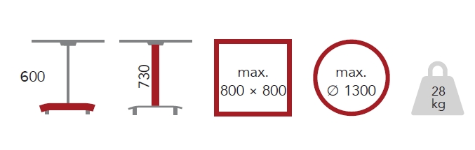 - Maximální rozměr hranaté stolové desky: 800x 800 x 18 mm